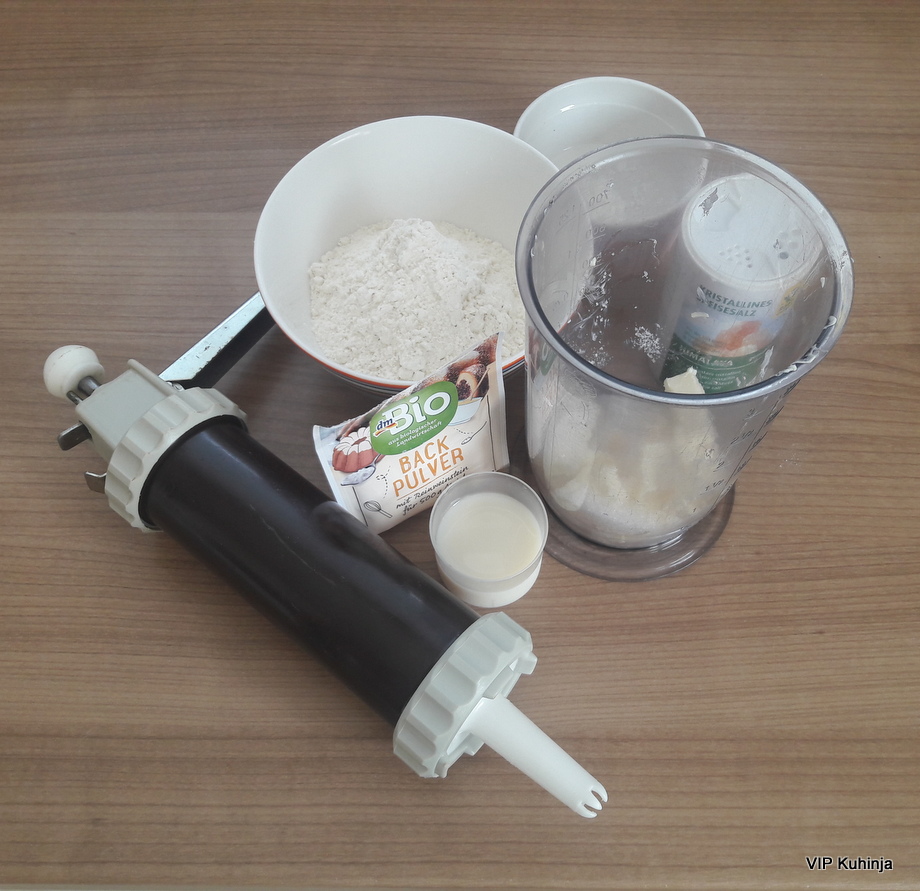 - Testo nadevam v aparat za brizgane piškote, s katerim oblikujem vrtnice, ki jih polagam na peki papir.